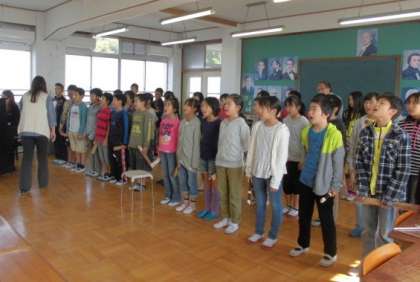 5年生は音楽室で学習発表会で歌う歌の練習をしていました。