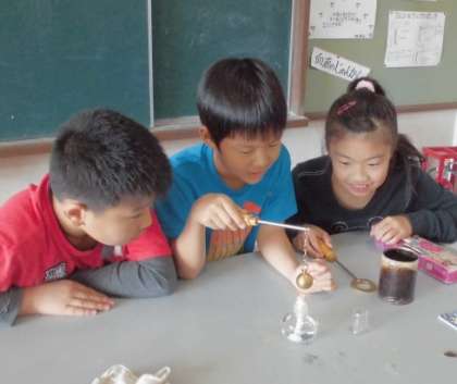鉄球をアルコールランプで熱しています。安全に気をつけながら,グループ仲よく協力して実験を進めていました。