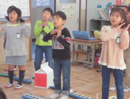 1年生は教室で学習発表会の劇中に歌う歌の練習をしていました。歌詞に合わせたふりをつけながら,一生懸命歌っています。すべての動作がかわいらしいです。