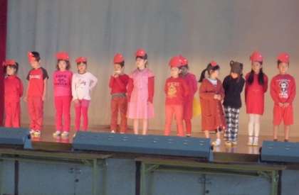 2年生は体育館で「スイミー」の練習をしていました。1匹だけ黒いスイミーが,赤い魚たちが力を合わせて作る大きい魚の目になって戦おうとする場面の練習をしていました。赤い服や黒い服を着てお面をつけての練習は,いつもよりいっそう力が入っていました。