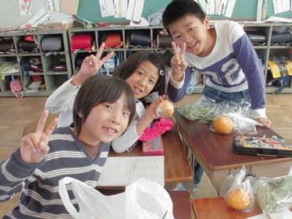 3年生は,地域の方の畑の見学を終えて,現地で教えてもらった内容について交流していました。振り返りのプリントにも,「こんなにたくさんの野菜の種類があるとは知りませんでした。」などと,新鮮な驚きを書いていました。子どもたちに現地で収穫させてくださったミカンや野菜など,一人一人にプレゼントしてくださったということで,子どもたちはとても喜んでいました。