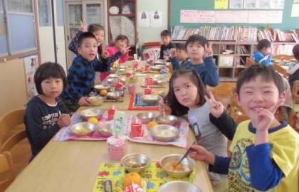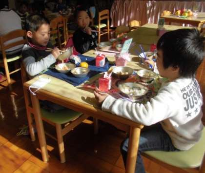 教室とはまた異なる雰囲気のお部屋で,大きなテーブルを囲んで食べる給食は一段とおいしく感じます。