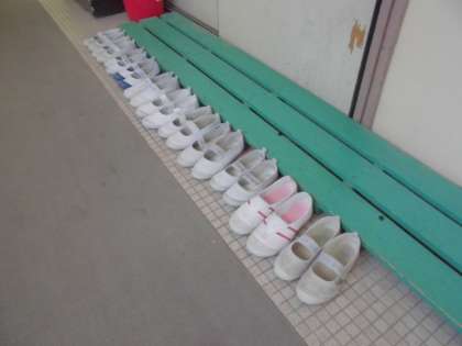 ランチルームの入口に脱いだ上靴がきれいに並んでいます。かしこいですね