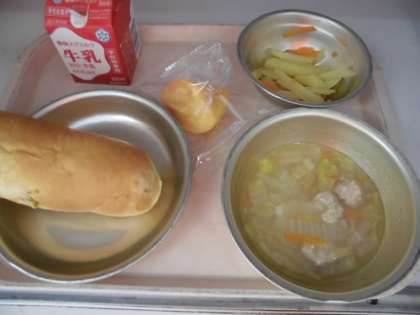 金曜日,28日の献立は,さつまいもコッペパン・牛乳・にくだんごのスープ煮・じゃがいものピリカラ炒め・柿でした。