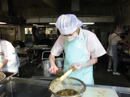 寒さが厳しくなってくると,野菜を洗う水も冷たいですが,給食調理員さんが朝早くから調理してくださっています。