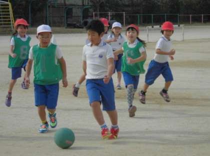 2年生の子どもたちは運動場でミニサッカーのゲームをしていました。ボールゲームは子どもたちが大好きな運動の一つです。グループ力を合わせて熱心にボールを追いかけていました。