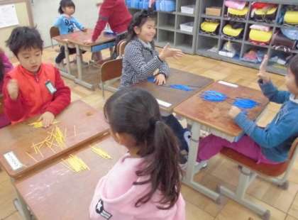 15時間の学習計画の『大きい数』の学習の1時間目の今日は,大きな数を数えるということに興味を持ちこれからの学習に意欲的に向かわせるための『棒取りゲーム』を楽しんでいました。