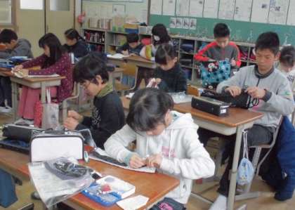 5年生1組の教室では,『ナップサック』の仕上げをしていました。