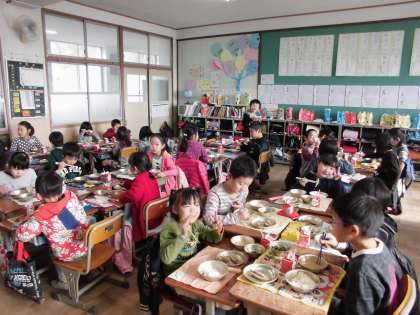 2年生では,お休みのお友だちの分で余ったししゃものおかわり,2尾を競ってじゃんけんしていました。ごはんのおかわりにも列ができています。「ししゃもは頭からしっぽまで食べられるよ。」と言うと,「知ってる〜。もう食べた!」と。ししゃものたまごを大事そうに食べている子もいました。