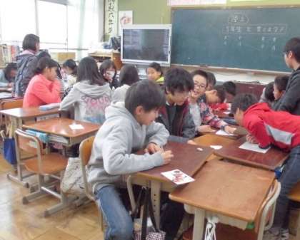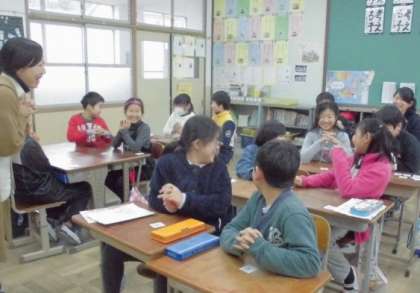 今日は,国語や算数など教科の名前の英語表現を教えてもらっていました。親しみと興味をもって学び合えるよう,今日はカードゲームを通して学んでいました。指導者も子どもたちも・・・・,教室中が笑顔と英語に満ちた素敵な空間となっていました。