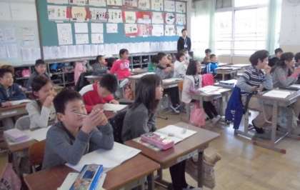 4年生は算数「小数÷整数」の計算になる文章問題を解いていました。『小数を割る』という問題場面を一人一人イメージし,図や言葉や線分図など自分なりの方法を使って答えを求めていました。その後,集団解決の場面では,自分の考え方を前に出てしっかり伝えあっていました。友だちの考え方を興味を持って聞けていることに感心しました。