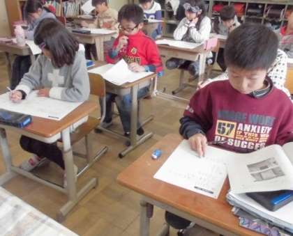 3年生は京都市立小学校において一斉に実施される『プレジョイントプログラム』に取り組んでいました。今日は社会の問題にチャレンジしています。問題用紙と解答用紙を突き合わせながら,どの子も真剣に問題に向かっていました。