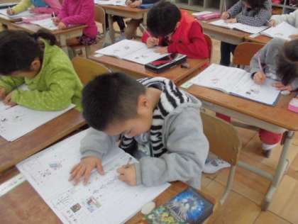 1年生は国語の学習で,今日も新出漢字の練習をしていました。今日教わったのは『赤』という漢字です。画数の難しい漢字もお手本を見ながら熱心に練習しています。毎日毎日教わる新しい漢字を確かに覚えていってくださいね。