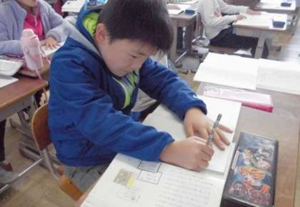 3年生は国語の学習でかるたについて学習をしていました。教科書に書かれている内容を読み取り,ノートに書き出しています。とても集中して学習をしている姿に感心しました。