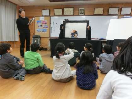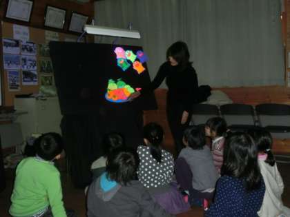 前半は,絵本の読み聞かせ,大型の紙芝居,パネルシアターなどがありました。パネルシアターでは,ブラックライトで照らされた「おばけちゃん」がとてもきれいに映し出されました。