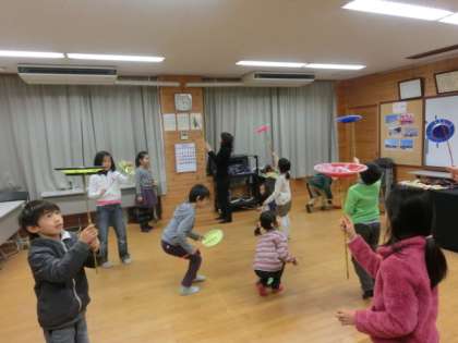 後半には,「南京玉すだれ」「皿まわし」の体験コーナーがありました。子どもたちは初めて体験する玉すだれや皿まわしに歓声をあげていました。皿まわしは,参加していた10名の子どもたちすべてがうまく回せるようになりました。