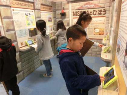 前半の部は,殿堂ブースで展示学習を行いました。たくさんのブースで京都に関わりのある研究者,企業,研究成果などをパネルやビデオ,実際の製品を見たり,タブレットを体験したりして調べ学習を行いました。