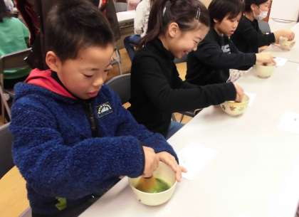 学びの振り返りでは,「苦かったけどおいしかったです。」「茶筅の使い方が難しかったです。」「二回目の方がいっそう苦く感じました。」など,体験を通して感じたことを伝え合いました。