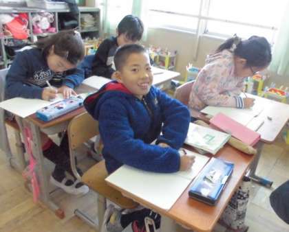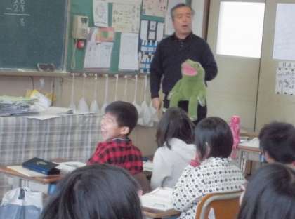 3年生は算数の学習で「小数のたし算を筆算で計算する方法」を教わっていました。みんな熱心に学んでいます。3年生の教室には,時々『がまくん』が学習に参加し,子どもたちを導いてくれているようです。
