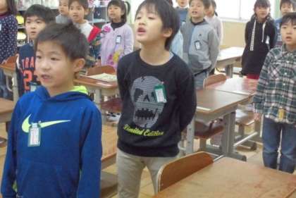 まず最初は,3月の『6年生を送る会』でみんなで歌う『さようなら』の歌の練習をしました。窓に貼ってある歌詞カードを見ながら,みんな熱心に練習をしていました。みんなの歌声を聞き,巣立っていく6年生もきっと励まされることでしょう。