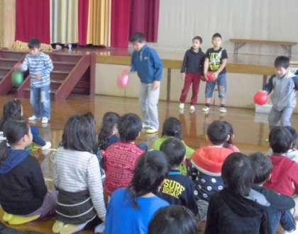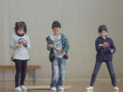 まず第1部は,12月の第1回目の交流会で教えていただいた昔遊びにその後一生懸命練習に取り組み,上手になった様子を遊びグループごとに前に出て見てもらう発表会をしました。