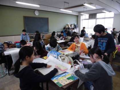 図工室では,5年生が学年合同で,パズルや作品袋の製作を進めていました。