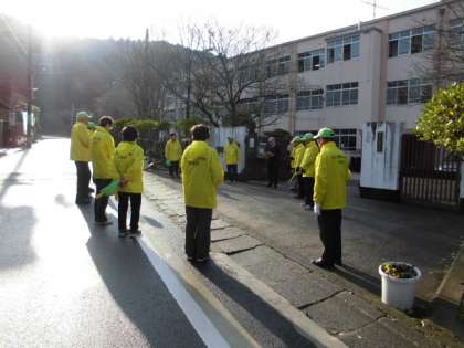 見守り隊の皆様も,それぞれの集合場所から子どもたちと共に,学校まで坂道を上り,お集まりくださいました。
