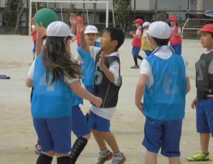 2年生の子どもたちは,運動場で『パスゲーム』を楽しんでいました。ゲームベストを着用しチームワークよく,ボールを繋いで,ゴールにシュートしています。どちらのチームも,一生懸命ボールを追いかけています。