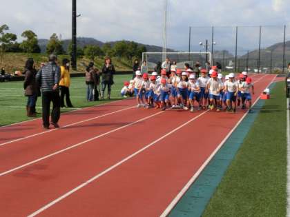 まず,1年生が1周400mを競走しました。ゴールした子から順番に並びました。「よーい、どん。」でスタートし,1年生は思い切りかけだしました。途中で,スピードが落ちた子もいましたが,度の子も最後まで走り切りました。