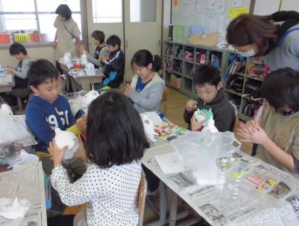 4年生は,図工の学習で『ランプシェード』を作っていました。空き容器に紙粘土をくっつけてベース整え,そこに,きれいな飾りをあしらっています。素敵なランプが出来上がりそうです。