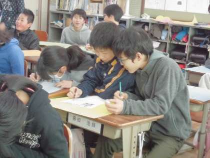2.自分以外の29人の友だちの机を巡り,その人の色画用紙に,その人の良さ(その人の,「えらいなぁ。すてきだなぁ。うらやましいなぁ。かっこいいなぁ。」等と思うところ)を記したメッセージを書く。