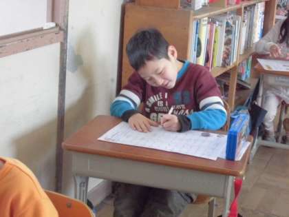 今年1年で習った漢字が定着しているかどうかの確かめのテストです。スラスラと鉛筆が動いている子,「う〜ん?」という感じでハタと止まってしまう子も・・・。みんな真剣に問題用紙とにらめっこしながら頑張っていました。