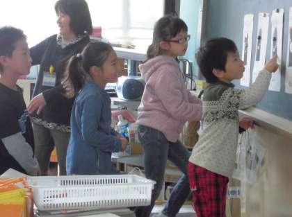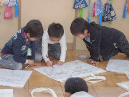 1年生の子どもたちは,床の上に作品袋を広げて,思い思いに絵を描いていました。お友達が描いている絵を傍から微笑みながら見ている様子が何とも言えず,素敵な雰囲気です。学級内が心安らぐ場として成立してきた様子が伝わってきます。