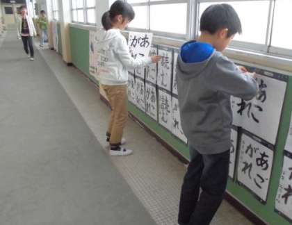 5年生の子どもたちは,3時間目に毛筆で書いた「あこがれ」という作品を廊下に掲示していました。今年最終の書写の作品にふさわしい題材ですね。