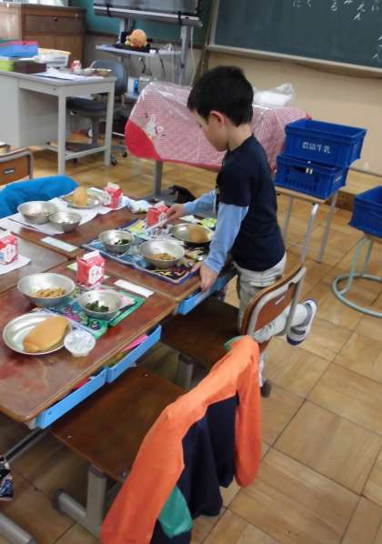 1年生の教室では,給食当番が意欲的に働き,あっという間に配膳できました!