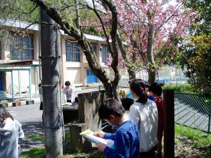 長く降り続いた雨が,ようやく止み,午後からは久しぶりにお日様が顔をのぞかせてくれました。その天候のために,屋外での観察が出来ずにいた4年生の子どもたちは,この晴れ間を活かして桜の木を観察しました。