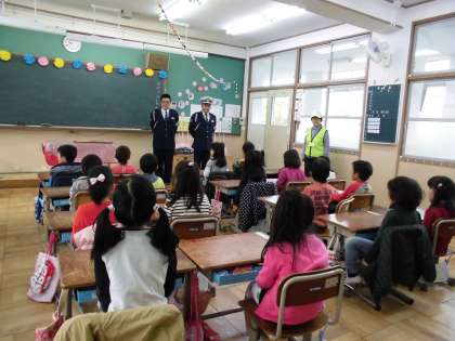 2時間目,1年生の教室に,山科署交通課の2人のおまわりさんが来てくださいました。