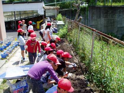 最後に,大きく育ちますようにと願いを込めて,たっぷり水をあげました。収穫まで,みんなでお世話を頑張りましょう。楽しみですね。
