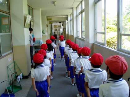 体育の時間になりました。着替えを済ませて廊下に並びます。その並び方も上手になってきました。