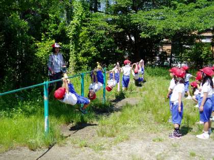 おしゃべりをせず,まっすぐに整列できていますね。今日の体育は,鉄棒あそびです。体操をしてから,お猿さんになって鉄棒にぶら下がり,前へ進みます。