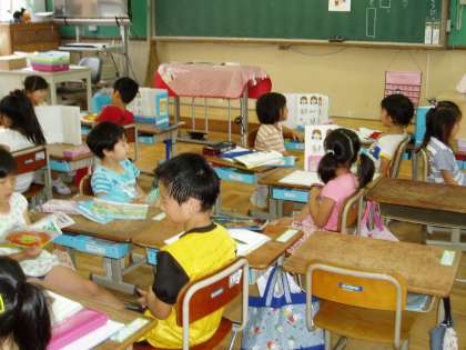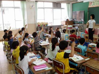 1年生の教室では,国語の時間に理由を付け加えて話す練習をしていました。初めにペアで練習を繰り返し,慣れてきたところで全体交流に移りました。