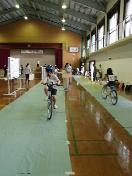 実技試験は,1回コースを周って練習した後,実技試験となります。あいにくの雨天のため体育館での活動になりましたが,より慎重にルールを意識して自転車に乗る様子が見られました。