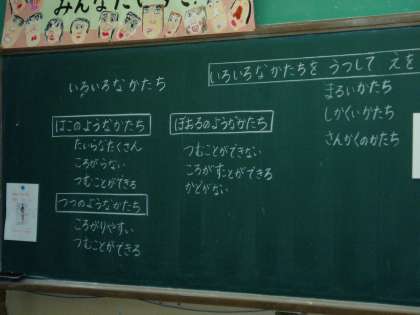 1年生の教室では,形の仲間わけをしたり,積み木を触って形の特徴をつかんだりしていました。