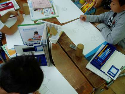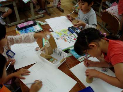 最後に,いろいろな積み木の形を画用紙に写し取り,形を組み合わせて模様や絵にしていました。