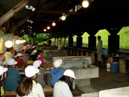 山の家で行う初めての野外炊事です。器具の扱い方や手順を教えていただき炊事を始めました。