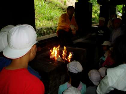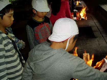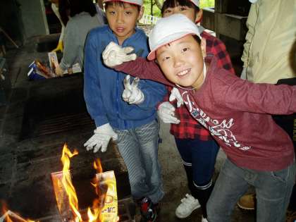 ホイルに包んだパンを紙パックに入れてから,焼き方を教わりました。各グループごとに分かれて,パンを焼いています。どんな出来上がりになるのか楽しみにしている様子でした。
