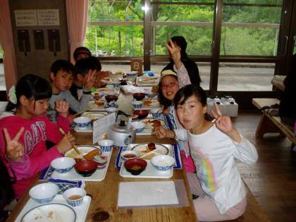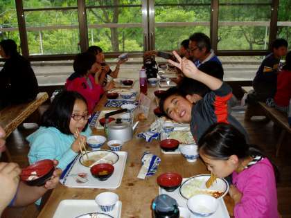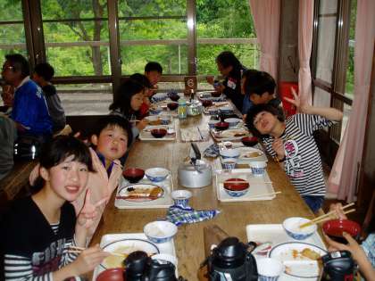 最後の夕食です。山登りの後なので,しっかりいただいていました。この後は,キャンプファイヤーです。