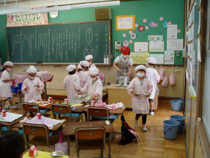 1年生も上手に給食当番ができるようになってきました。