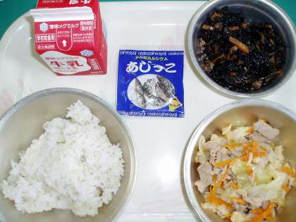 今日の給食には,『ひじきの煮つけ』と『豚肉とキャベツの味噌いため』が登場しました。どちらも,ご飯に良く合う美味しい献立です。