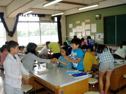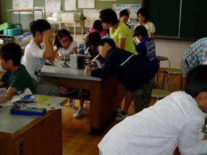 5年生は理科室でグループごとに顕微鏡の使い方を練習しています。初めて扱う子どもたちも多く,顕微鏡の扱い方や見え方を学習した後,実際に試してみました。